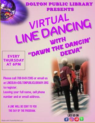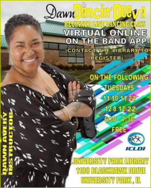 Dolton Library6:00-7:00pmBeginnersFREEContact Dolton Library or Dawn to get registered and signed up to get the weekly YouTube linkThis class also has a Band page. The YouTube link is shared via text, email and also posted on the Band page. Follow the link to join the class on BandDolton Library 708 849 2385Dawn 708 705 8489https://band.us/n/afac48A2cf36Z